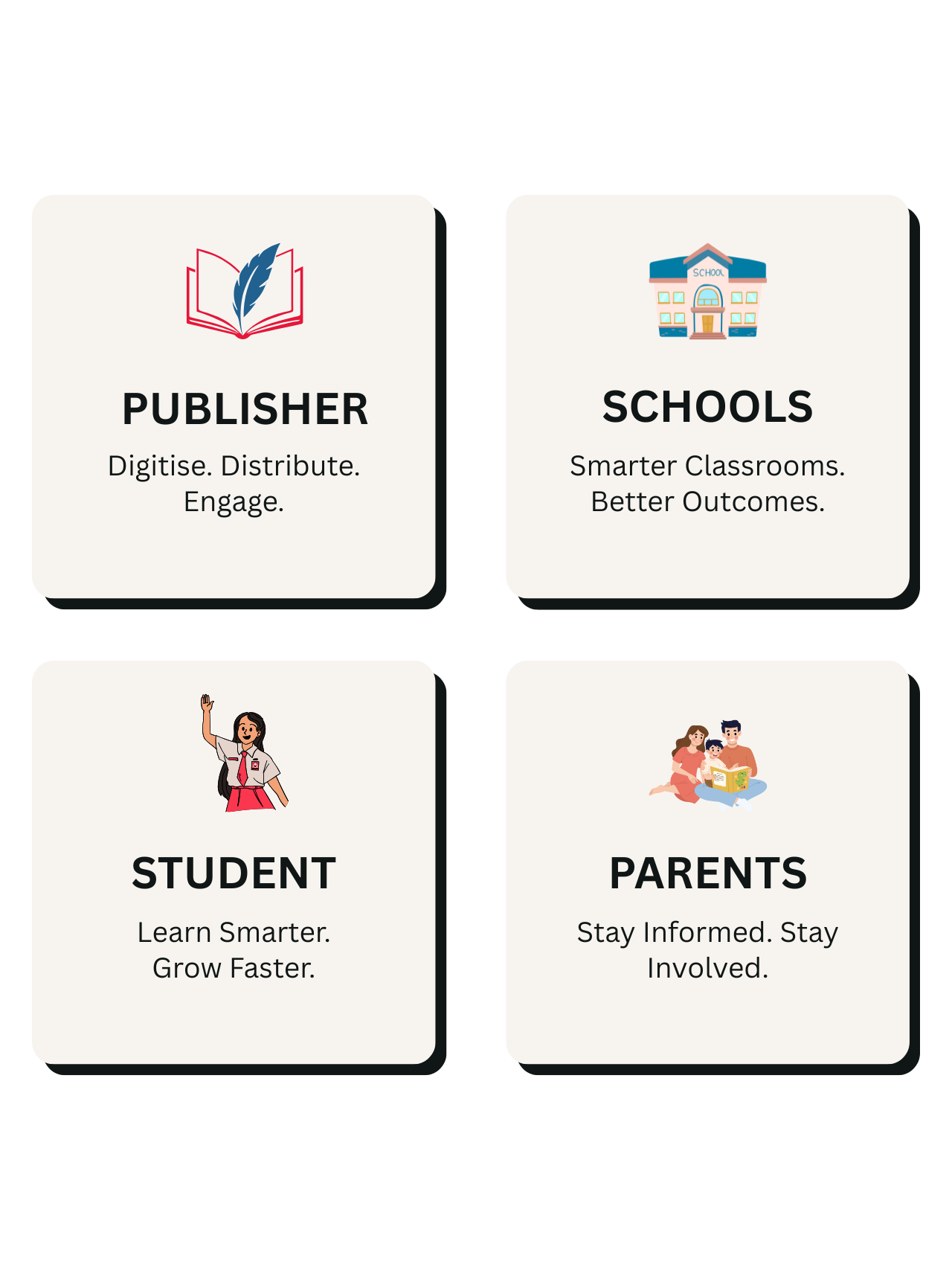 SmartBook is designed for publishers, schools, teachers, students, and parents. Publishers use it to create digital SmartBooks, schools use it to manage learning and assessments, while students and parents benefit from personalised insights and progress tracking.